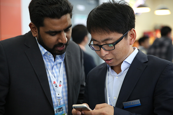 工作人員向國外客戶 介紹公司產(chǎn)品